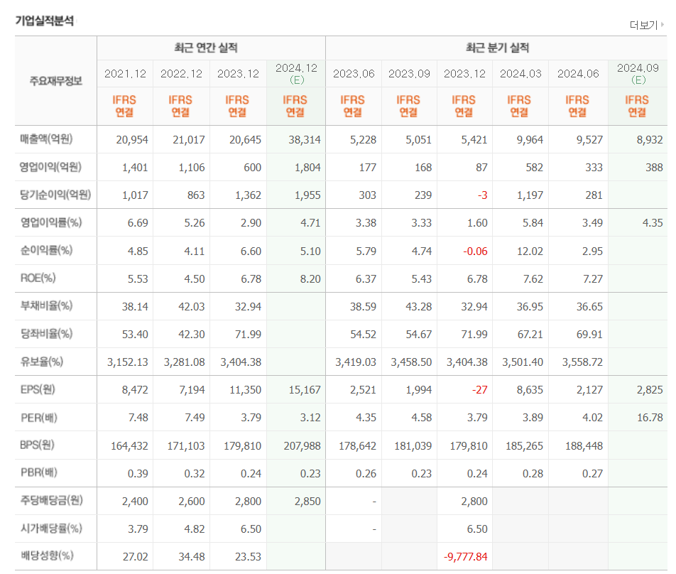 1년 기준 신저가 40,300원 고려하면 중간 정도의 주가다 (241107 기준)