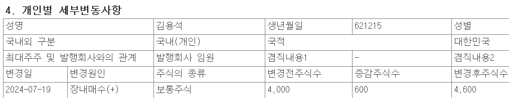최대주주등소유주식변동신고서에서 600주를 장내매수한 임원이 있음